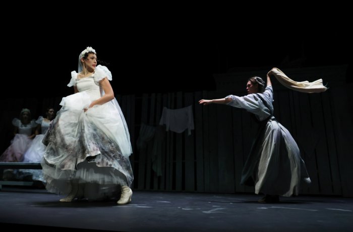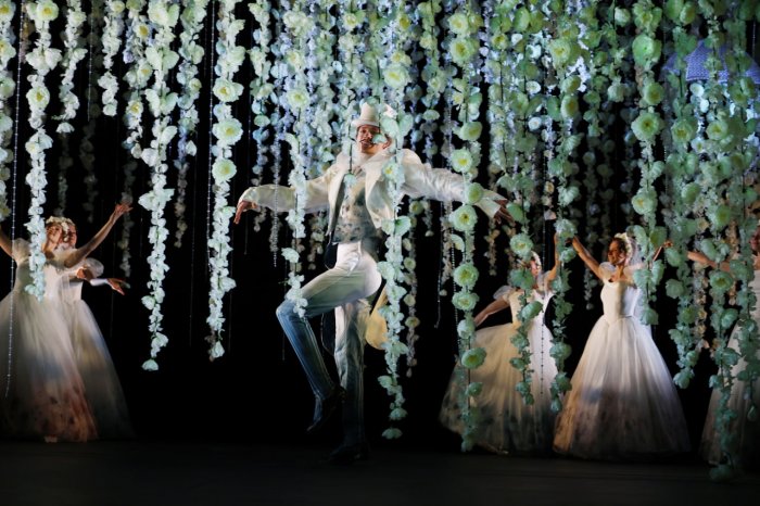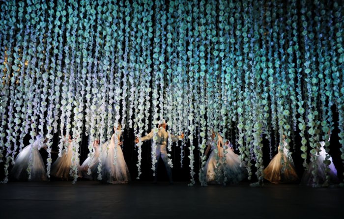 Во время сна Бальзаминова по сцене летают – то падая, то поднимаясь откуда-то из глубин бальзаминовской фантазии – белоснежные цветы на лианах. Их необычайную легкость поддерживают парящие, словно облака, платья хореографической группы невест, о которых грезит Михайло Дмитрич. Неповторимый характер каждой подчеркивают пышные, скрывающиеся под прозрачной тканью, подолы (художник по костюмам Мария Боровская). Так и складывается атмосфера желаемой Бальзаминовым свободы – фантазии, где возможно все. «В сумерках отчего ж и не заняться иногда, не помечтать-с?», – говорит Михайло Дмитрич.