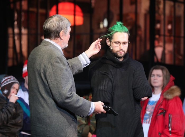 Девочка-дебютантка в розовых колготках (натягивала их в проходе как сама непосредственность: «Я же актриса…») теперь «замазана» вульгарным макияжем. Ее артистическая программа, проверенная в электричках и на детских праздниках, – совершенно жалкое зрелище. «Приоритета духовного над материальным» – одной из основ русской культуры, как всем напомнили в прологе – здесь и в помине нет, а есть только отчаянная попытка выжить. Нина может танцевать под песню «Пропадаю я» (как в попсовых клипах, только хуже, грязнее), может встать на пуанты и кое-как прыгнуть из кулисы в кулису, может пускать мыльные пузыри. И, собственно, это всё, что осталось от чистоты и желания «дотянуться до себя в творчестве». Никакого театра и уж тем более «новых форм». Пошлые блестки и дешевая анимация. Застрелиться можно, глядя, как эта «маленькая клоунесса» демонстрирует свою беспомощность, творческую и человеческую, свою растерянность перед жизнью. Костику она не оставляет выбора. Провалявшись лицом в луже весь первый акт, во втором он сменит зеленые волосы и свитер oversize на костюм, в каком только в гроб кладут, получит, наконец, протезы – и, наверно, с точки зрения мамы, на человека станет похож. Но лучшего применения рукам (да и себе), чем кормить своего гигантского черного пса (настоящего, породы ньюфаундленд) – он не найдет. И с собой прошлым покончит еще до того, как нажмет на курок. Попытки достучаться до болезненно любимой мамы, до культурного сообщества и до носителей «основ государственной культурной политики» Костик оставит, чтобы не бить хвостом, как брошенная на доски, еще живая рыба – чтобы не длить это мучительное состояние и не знать, как бесконечно длит его Нина.