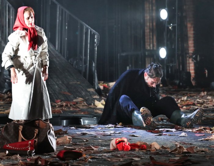 На дачу Аркадина (Виктория Исакова) и Тригорин (Александр Матросов) приезжают не летом, а осенью: двор рядом со старой террасой – где красный абажур и мелочи из прошлой жизни – завален жухлой листвой, но если присмотреться, то вполне можно принять это за пожелтевшие листы книг, ставших макулатурой, или неизданных рукописей, или бумаги, где не осталось и следа от замыслов – здесь никому не нужных, как и Костик (Александр Дмитриев).