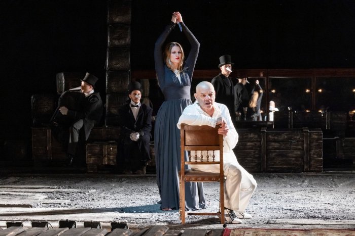 В первом действии он именно по-детски простодушный наблюдатель, правда, может мгновенно включиться в игру, зажечься, как лампочка – не против и «порулить», поуправлять, перехватив воображаемый руль у Городничего. Причем сначала эта поездка одной большой (театральной) компанией – чистый драйв (сравнимый с тем, какой артист получает от творческого процесса). «Я же еще не наигрался!..» – для Райкина это ключевая, очень личная фраза. Она – про театр как образ жизни, как «прописку», как параллельную реальность, где можно спастись от бессмысленности. Киношлягер 1939 года «Далеко, далеко за морем» из «Золотого ключика» – о стране-утопии за заветной, запертой дверцей – актеры поют хором, похоже, держа в уме новый театр, куда «Сатирикон» не может въехать целых семь лет. Ожидание затянулось настолько, что своя сцена уже кажется чем-то невозможным, несбыточным.«До гибели всерьез»