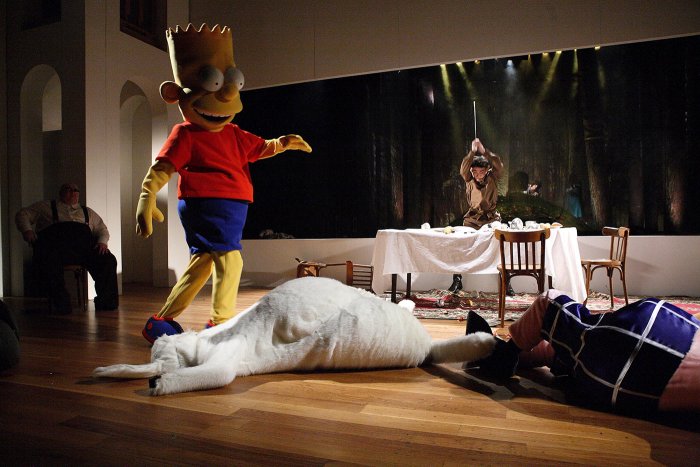 «Я хочу поставить такой спектакль – чтобы было долго ничего не понятно, но очень интересно, – цитируют Дмитрия Крымова на сайте театра. – Очень долго ничего не понятно. Но интересно. А потом, не переставая быть интересным, стало бы все понятно. Только не сразу, но довольно быстро. И не то, чтобы «понятно», а, скорее бы, появилось чувство, что ты понимаешь, куда все это клонится. А когда все это наклонится туда, откуда будет уже совсем все понятно, то не возникло бы мысли, что ты напрасно провел время. А еще в конце очень хочется сделать ту сцену из «Оптимистической трагедии» Всеволода Вишневского, где у старушки якобы украли кошелек, а потом она его нашла. И чтобы был антракт и занавес. И бутерброды с колбасой в антракте. И тюль с наклеенными деревьями. И большой обеденный стол с чашками. Чтобы были мир и покой. И еще много стрельбы из разного оружия и крови».