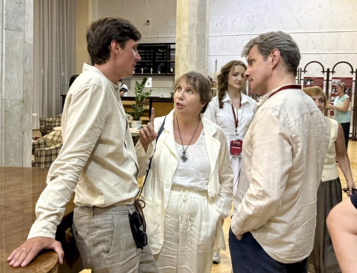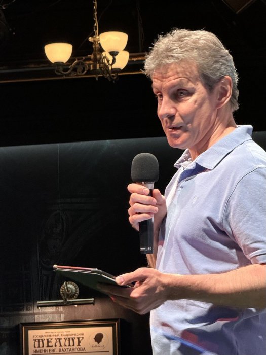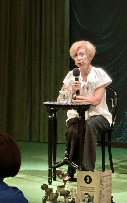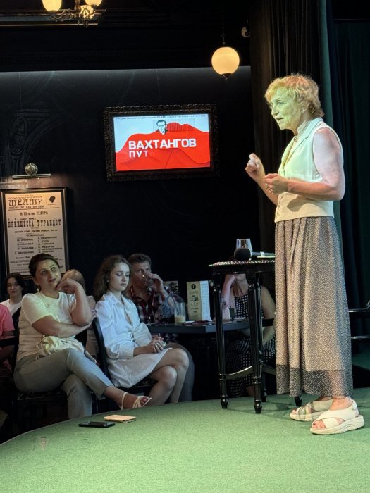 Марина Райкина, театральный обозреватель и автор театральных книг, рассказала о тайнах особого вахтанговского юмора, который сохранился от времен Вахтангова до времен Туминаса, оставаясь умным, ироничным и современным. И обаяние Марины, ее тонкий юмор и потрясающее знание вахтанговской истории тоже покорили слушателей.