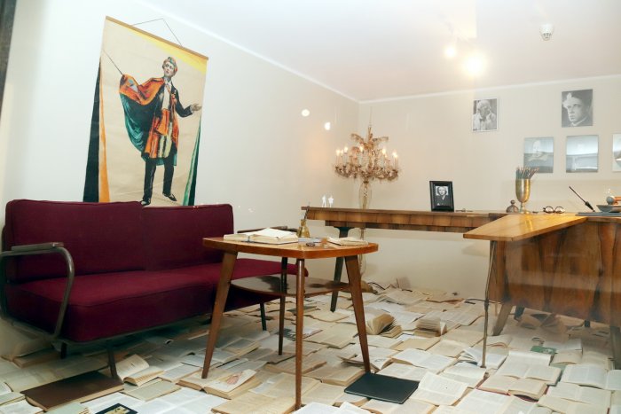 Завадского в пространстве экспозиции можно не только увидеть, но и услышать. В телефонную трубку (она здесь же, перед кабинетом) Юрий Александрович читает «Евгения Онегина».