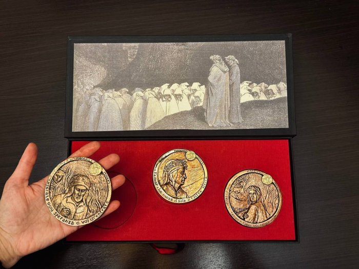 Теперь в музее Мастерской Петра Фоменко добавятся важные экспонаты: медали с профилем Данте и иллюстрациями к кантикам «Божественной комедии» «Ад», «Чистилище» и «Рай» займут свое достойное место.