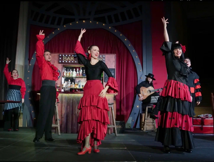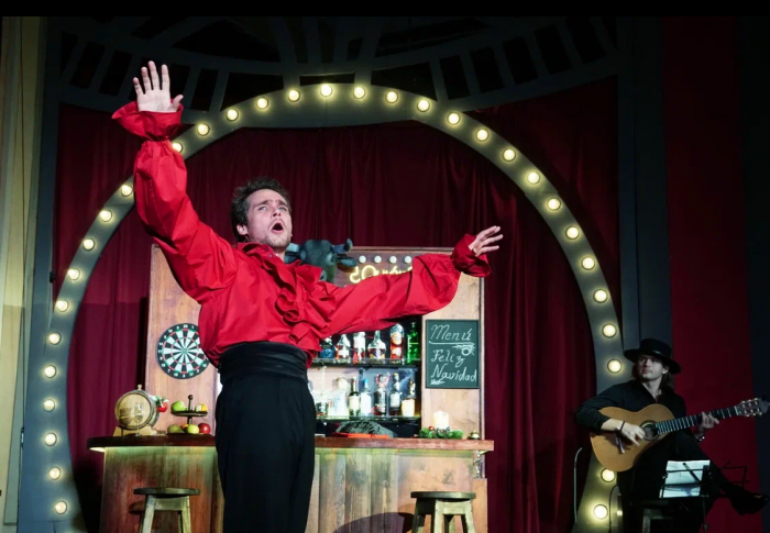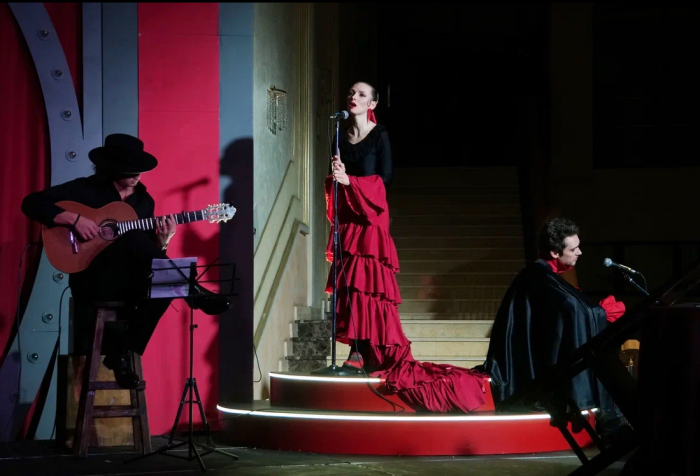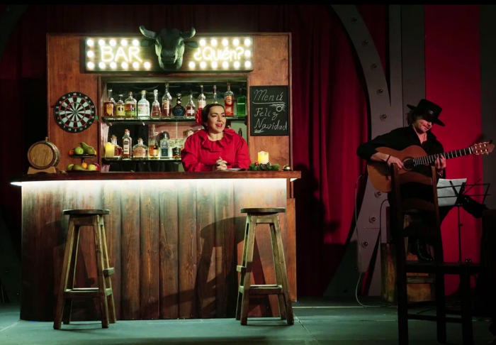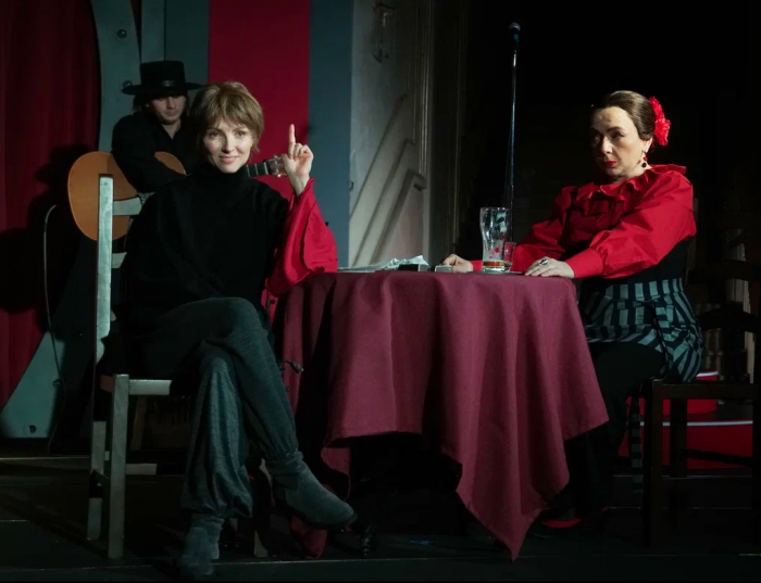 Двойственность героев показана даже на уровне сценографии Юлии Коротковой. Штаны Госпожи Y разной длины, половина ее накидки переливается на свету. Рубашка Господина Y тоже собрана из разных лоскутков. Такие люди-мозаики, потерянные в реалиях взрослого мира дети. Разговаривают о жизни, пока их диалоги не прерывают мизансцены с поющей испанские песни хозяйкой бара (Алина Ивах). Эти строчки уже знакомы русскому зрителю, несмотря на страну их происхождения. «Гитару» Федерико Гарсиа Лорки переводила Мария Цветаева, «О, голубка моя» пела Алла Пугачева. Почти каждая испанская композиция в русской трактовке взята из репертуара Клавдии Шульженко, ключевой фигурой для мира советской эстрады 1940-х годов.