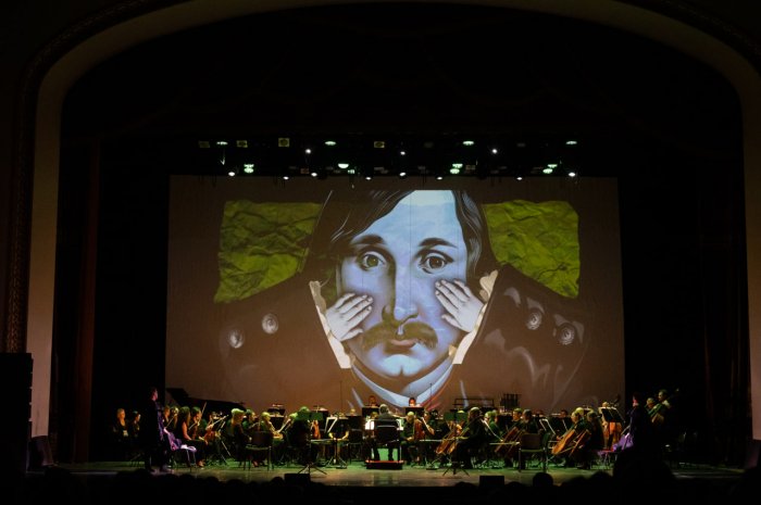 Альфред Шнитке ценил творчество писателя, не раз обращался к его произведениям и больше всего увлекался «столкновением возвышенного и низменного» в гоголевских текстах. Все это непостижимым образом ему удалось выразить в своей «Сюите», которую виртуозно исполнял оркестр «Новая Россия». Как только музыка зазвучала, она сразу потянула за собой образы. И дороги, по которой в своей Бричке едет Чичиков. И провинциального города NN с его сплетнями и испуганными Чичиковым чиновниками. И балов, где так забавно наблюдать за жеманностью дам, желающих показать себя с лучшей стороны.Те самые дамы на экране представлены очень акцентно — лица с большими глазами и пухлыми губами, приделанные к ним хорошенькие ножки в разных миленьких туфельках, носочках и чулочках. Все, чем по сей день стремится пощеголять светская кокетка, собрано, как кубик Рубика, в утрированные женские нечто. И эти «нечто» так и кружат вокруг экранного Гоголя. Он успевает только водить глазами влево-вправо и покачивать своими усами.
