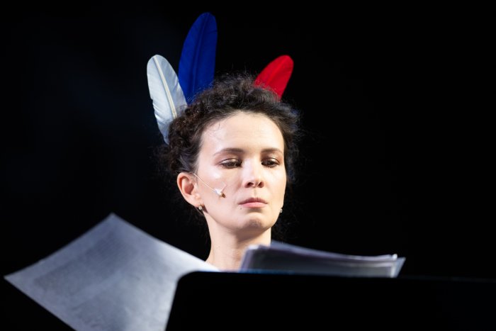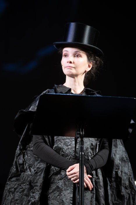 Что касается «смены имиджа» под нужный контекст, то в этом артистам помогают костюмные детали — цилиндры, манишка, чепцы или перья. Так, когда рассказчице Марии Смольниковой полностью доверили описание нравов жительниц города NN (рассказчику как джентльмену развивать эту тему как-то не комильфо), на словах «это не губерния, это столица, это сам Париж!» она дополнила свою прическу с красным пером еще двумя — синим и белым. Получилась отсылка и к российскому, и к французскому триколору. Ведь губернские дамы так любят изъясняться на французском…