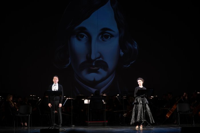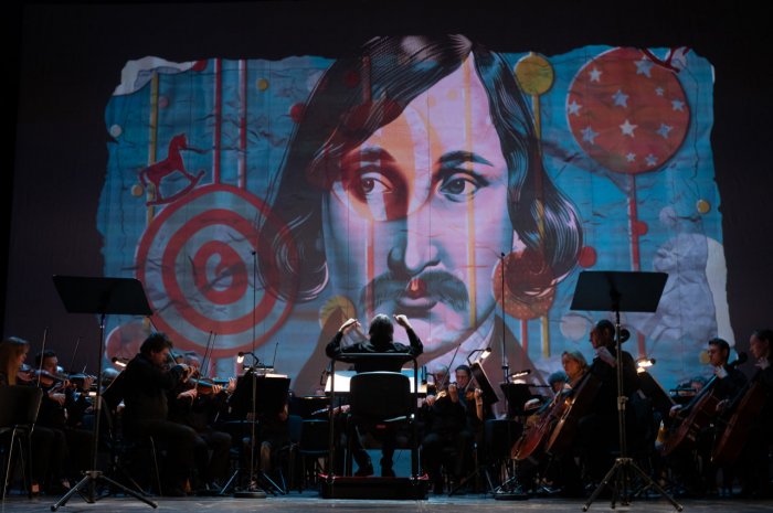 Постановку, режиссером которой выступила Марина Брусникина, приурочили к 90-летию композитора Альфреда Шнитке. С ним Юрия Башмета связывали годы дружбы и тесного сотрудничества, уточняют на сайте фестиваля. Оркестр под управлением Башмета исполнил «Гоголь-сюиту» Шнитке, написанную к спектаклю Театра на Таганке «Ревизская сказка» 1978-го года. Музыкой спектакль-концерт и открылся. Необычная и очень живая, она как-то сразу увлекла даже тех, кто к симфоническим концертам в общем-то равнодушен. Музыка стала ассоциироваться с Гоголем. И дело не в том, что на огромном экране над сценой в этот момент чудесами компьютерной графики «ожил» портрет Николая Васильевича. Просто в сочинении Шнитке соединилась парадоксальность, мистичность, легкая тревожность и много юмора и смеха, который у Гоголя, как известно, был сквозь слезы.