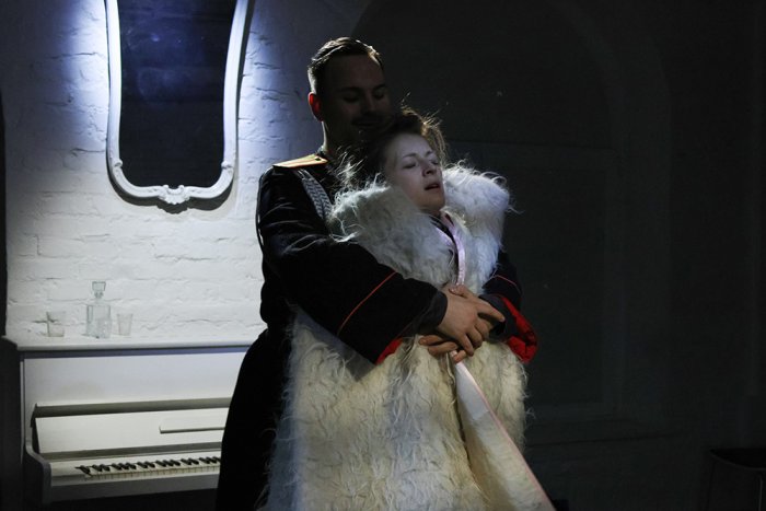 Белый рояль и деревянный помост, на котором лежат усыпанные тревожным снегом Гражданской войны юнкера – вот первое, что видят зрители ещё до начала спектакля. И кажется, что ничто не предвещает беды – завораживающе успокаивающий голос Анастасии Вяльцевой с пластинки прошлого века (звукорежиссёр – Владислав Кононов), приглушённый свет (художник по свету – Александра Демчева)… И только после того, как все заняли свои места на левом и правом берегу, явственно ощущается треск неспешно плывущего корабля Российской империи.