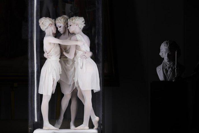 «Они заблудились в галерее, каждый должен найти ту картину, которой принадлежит. Это те самые постояльцы «Золотой лилии», которые теряют то наряды, то шпагу, они нелепы и забавны, постоянно о чем-то беспокоятся, не понимают, куда их занесло, но именно здесь их и ждет финальное торжество: в контексте галереи это, безусловно, вернисаж, открытие экспозиции, — рассказывает режиссер. — Да, к финалу мы поймем, что все они — персонажи одной картины — «Коронации Карла X», посвященной тому событию, ради которого и была написана опера».