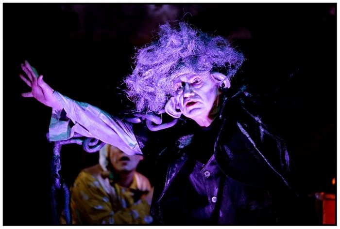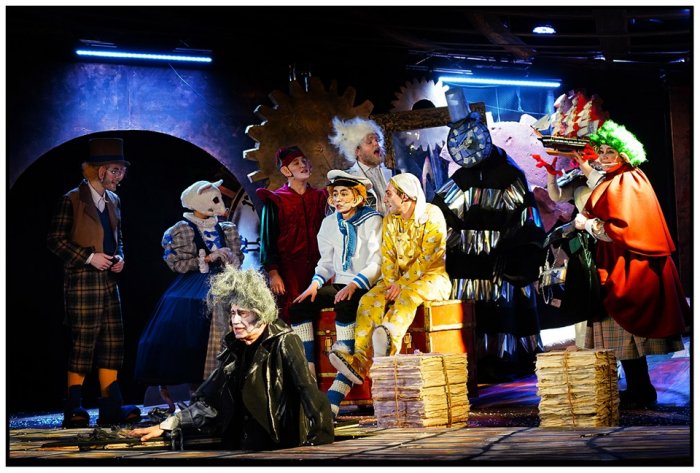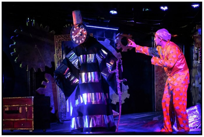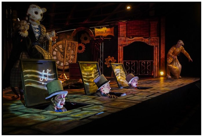 Вращаются и бегут стрелки огромных часов; открываются и закрываются двери-циферблаты; трансформируется зеркало, выводя на сцену героев из прошлого; со стуком открываются врата преисподней; зубастая сумка Дамы из благотворительного фонда (Ирина Смирнова/Наталья Кораблева) чуть не проглатывает Скруджа; а из камина выходят новые просители. Знакомую современному человеку ситуацию, когда попадаешь в круговерть заданий, обязанностей и просьб, Скрудж разрешает жизненно просто: прогоняет всех и накрывается золотым одеялом. «Черт бы вас побрал!», — несколько раз чертыхается Скрудж. И сам вызывает чертовщину.