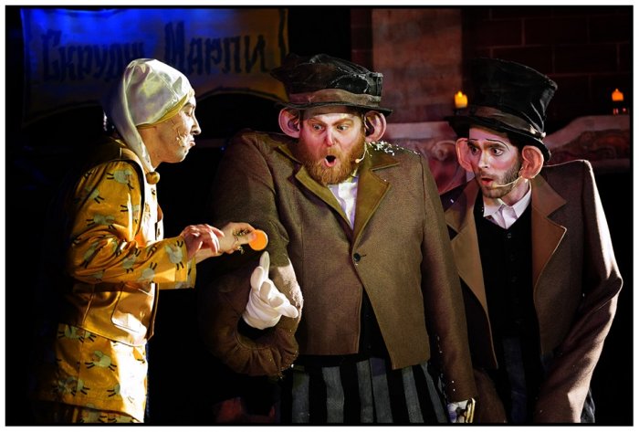 Из комнаты Скруджа (Никита Манылов/Иван Коротышёв), засыпающего на сундуке, действие переносится к пропасти могилы, которую выкапывают Могильщики (Станислав Хомков, Алексей Чумак, Николай Борисов, Павел Корчевский). Утрированно-смешные, недотепистые, с лопатой и ложкой, играя со временем и жизнью, они оказываются лучше скряги Скруджа, который жалеет вознаграждения, протягивая им монету на веревочке, возвращающей ее обратно. Когда в могилу падает безжизненное тело Марли («мертвого, как гвоздь в притолоке»), в зале повисает тишина. И в Скрудже все давно омертвело: и родственные чувства, и ожидание Рождественских чудес. Лейтмотивный напев горожан (Олеся Гурина, Алина Каракчеева), выглядывающих из люков, словно из окон домов с открывающимися ставнями: «Ну и скряга этот Скрудж» – становится ключом к образу главного героя, появляющегося в пижаме и тапочках золотого цвета с золотыми одеялом и подушкой, считающего во сне золотых барашков.