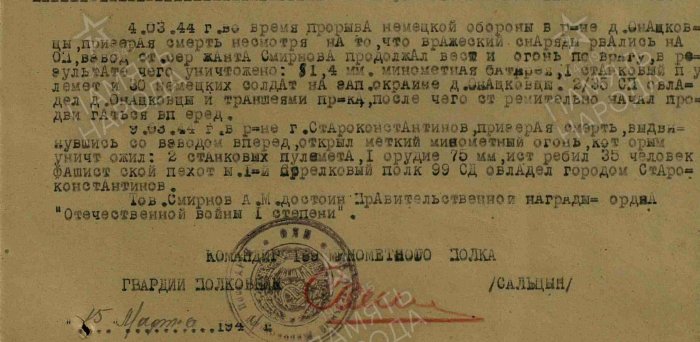 «4.03.44 г. во время прорыва немецкой обороны в р-не д. Онацковцы, презирая смерть несмотря на то, что вражеские снаряды рвались на СП, взвод ст. сержанта Смирнова продолжал вести огонь по врагу, в результате чего уничтожено: 81,4 мм миномётная батарея, I станковый пулемёт и 30 немецких солдат на западной окраине д. Онацковцы. 2/35 СП овладел д. Онацковцы и траншеями противника, после чего стремительно начал продвигаться вперёд.