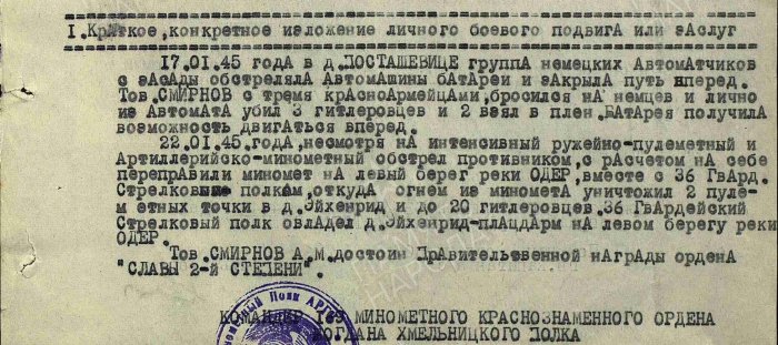 «17.01.45 года в д. Посташевице группа немецких автоматчиков с засады обстреляла автомашины батареи и закрыла путь вперед. Тов. Смирнов с тремя красноармейцами бросился на немцев и лично из автомата убил 3 гитлеровцев и 2 взял в плен. Батарея получила возможность двигаться вперед.