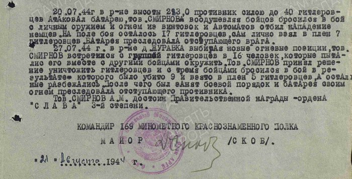«20.07.44 г. В районе высоты 283,0 противник силою до 40 гитлеровцев атаковал батарею. Тов. Смирнов, воодушевляя бойцов, бросился в бой с личным оружием и огнем из винтовок и автоматов отбил нападение гитлеровцев. Батарея преследовала отступающего врага.
