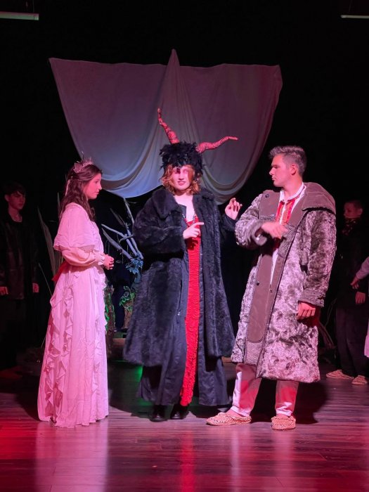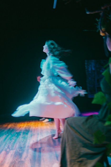 В этой «Снегурочке» есть элементы пластического спектакля и фольклорные костюмы, а миры разных героев разделяются и сценографически, и жанрово, и даже отчасти музыкально. Так, лешие живут в лесном мире, Весна с Морозом – в совершенном ином, а люди и царь Берендей – в своих, не похожих на другие. Кстати, Берендея в спектакле играет актриса, поэтому уместнее говорить не о царе, а о царице.