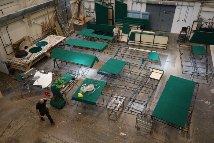 Большая часть декораций для спектакля «Весьма остроумная комедия о виндзорских женушках» уже установлена на сцене, остальные детали – в финальной стадии сборки.