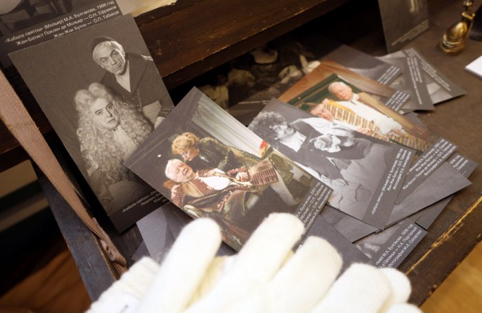 Выставка рассказывает о непростой истории «Кабалы святош» в Художественном театре. Первый спектакль запретили после семи показов, но к написанной специально для МХАТА булгаковской пьесе в театре возвращались еще дважды. Адольф Шапиро ставил «Кабалу святош» в МХТ в 1988 и 2001 годах. Роль Мольера в его спектаклях играли Олег Ефремов и Олег Табаков соответственно.