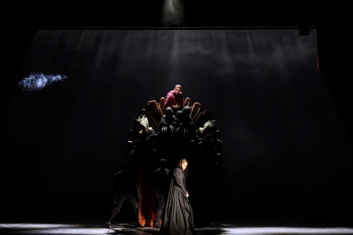 Кажется, режиссер собрал все, до чего дотянулся, как ребенок в магазине игрушек: вот арапчата в черном трико и белых гофре – слуги просцениума, вот королева-мать, отсутствующая у Булгакова, живой монумент в черном кринолине, который возят на платформе – Павел Ващилин в этой роли комически дает уроки макиавеллизма, с не сходящей с набеленного лица брезгливостью поучает сына, что власть должна внушать восторг и страх. Вот тонкий гибкий силуэт в черном сюртуке – это Лагранж в исполнении Ильи Козырева, регистр, ставший в спектакле и альтер-эго Булгакова, но эта двойственная роль не ложится в действие, и без того лоскутное, а прошивает ее черными стежками сверху – Регистр не без доли демонизма порхает по сцене как бы отдельно от всех.