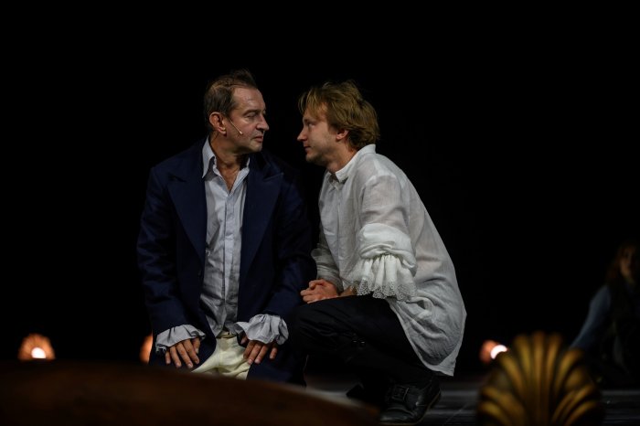 И наконец – тот, ради которого. Тот, который. Центр гелиоцентрической вселенной XVII века и спектакля. Король-солнце в исполнении «Максимова» – Николая Цискаридзе. Тут надо отдать должное безупречному чутью тех, кто предложил ректору Вагановского училища эту роль. Это не только оправдавшийся расчет на жгучий зрительский интерес и кассовый успех. Это прежде всего – понимание его отдельного места в спектакле, вознесенного над прочими. Иной природы существование и сама актерская эманация, чем у драматических. Звезда, легенда. Вот он встает вполоборота, подбоченясь, выставив вперед ногу в белом чулке и перекинув мантию через плечо – и в секунду превращается в самый знаменитый портрет монарха работы Гиацинта Риго. Цискаридзе не просто позволяет зрителю всласть собой налюбоваться, он обнаруживает драматический талант, тонкость, сложность игры – его Людовик не памятник, он живой человек, который стал воплощением страны. «Франция – перед вами, она ест цыпленка и не беспокоится», – ни у кого, кроме Цискаридзе, это не получилось бы такой правдой. И хорошее французское произношение, у единственного. За каждым его движением, поворотом, жестом руки хочется следить, не отводя глаз – так работает эта харизма, эта грация, этот магнетизм, которому не хотят и не могут сопротивляться ни партнеры по сцене, ни зрители в зале. Шуткам короля смеются не просто с готовностью – с радостью. С ним себя ассоциируют все, от умников до простаков. Спектакль построен на него и вокруг него. Его Людовик побеждает архиепископа и покоряет церковь, он размазывает мальчишку Муаррона, которым явно брезгует, он благоволит к Мольеру, но безоговорочно затмевает его, подобострастно замершего на другом конце стола в сцене их ужина.