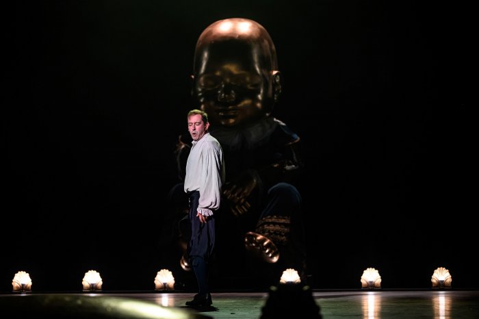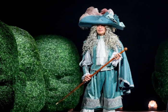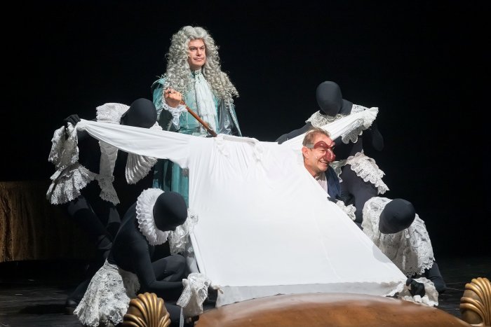 Подмостки Николай Симонов уставил гигантскими пупсами – то гидроцефалическими их фигурками в огромном стеллаже, то отдельно мега-головами, выстриженными из зеленых кустов. Двое молодых актеров с надетыми на плечи такими же головами качаются на доске-качели – это маленькие Мольер и король, у второго голова вызолочена. В следующем своем появлении Людовик в маске, закрывающей лицо, с лучами во все стороны, танцует (здесь это юная Вера Ефремова), и лишь в третий раз является во всем блеске в исполнении «Максима Николаева», но об этом позже. Без видимой связи с модификациями младенцев на сцене будут: алого бархата и золотой бахромы занавес, ездящий по кругу, и расставленные по кругу же огни рампы, без кулис – так складывается немудрящая метафора «весь мир – театр» – и это все, что придумано про едва ли не самую театральную эпоху. Сверху – падуги того же бархата с буквами КС, что трактуй как хочешь. Еще на сцене появятся и исчезнут монарший стол «ковидной» длины, кабинка исповедальни с живыми бесами, квадригой замирающими на ней, и гримерки справа и слева.
