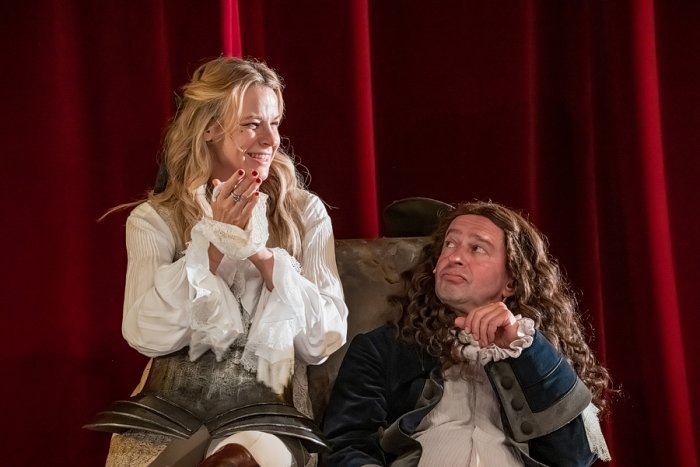 Подмостки Николай Симонов уставил гигантскими пупсами – то гидроцефалическими их фигурками в огромном стеллаже, то отдельно мега-головами, выстриженными из зеленых кустов. Двое молодых актеров с надетыми на плечи такими же головами качаются на доске-качели – это маленькие Мольер и король, у второго голова вызолочена. В следующем своем появлении Людовик в маске, закрывающей лицо, с лучами во все стороны, танцует (здесь это юная Вера Ефремова), и лишь в третий раз является во всем блеске в исполнении «Максима Николаева», но об этом позже. Без видимой связи с модификациями младенцев на сцене будут: алого бархата и золотой бахромы занавес, ездящий по кругу, и расставленные по кругу же огни рампы, без кулис – так складывается немудрящая метафора «весь мир – театр» – и это все, что придумано про едва ли не самую театральную эпоху. Сверху – падуги того же бархата с буквами КС, что трактуй как хочешь. Еще на сцене появятся и исчезнут монарший стол «ковидной» длины, кабинка исповедальни с живыми бесами, квадригой замирающими на ней, и гримерки справа и слева.Перед нами пышная, многословная, с хорошими актерами разных школ и стилей, с некоторыми интересно решенными сценами, великолепными костюмами Игоря Чапурина и светом Ивана Виноградова работа, очень нестройная драматургически, стилистически и исполнительски. Она не складывается в высказывание, но вырисовывается в явление, возможно, помимо воли авторов.
