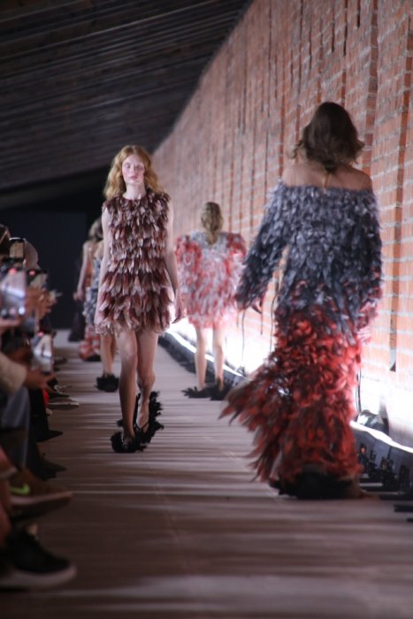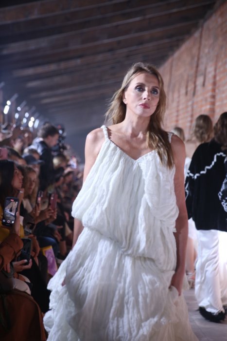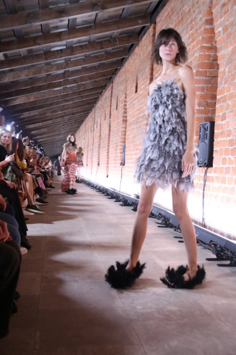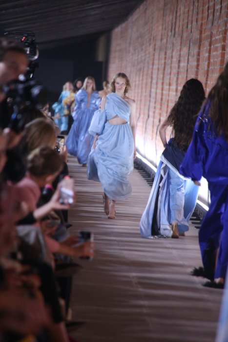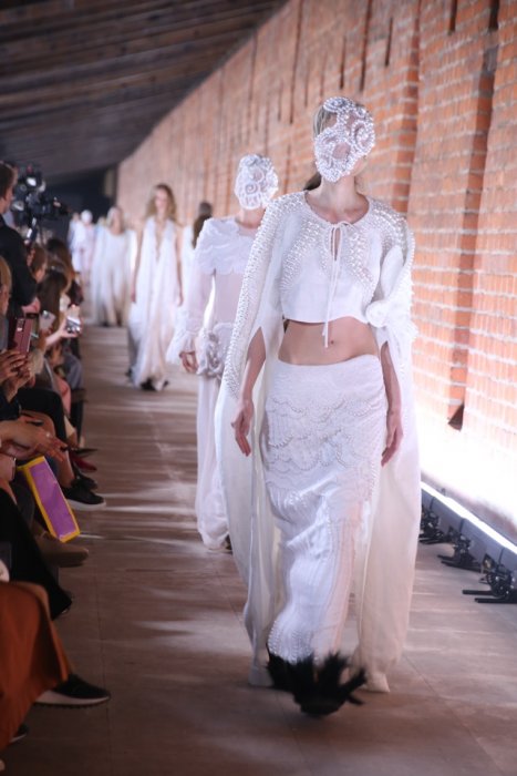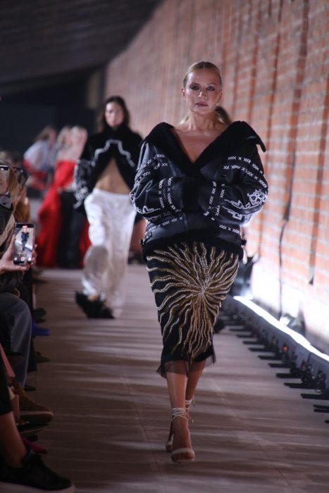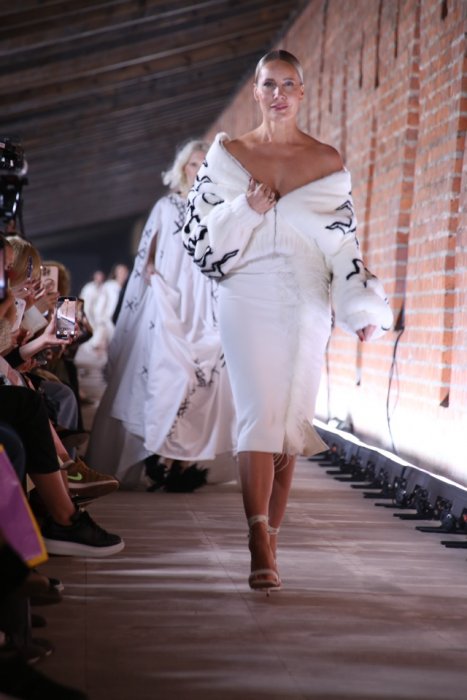 Демонстрации сказочной коллекции соответствующей атмосферы добавила и локация показа – пространство Китайгородской стены. Образы линейки были дополнены жемчугом, металлическими дисками, перьями. По подиуму дефилировали царевны и женщины-птицы, а также модели в образах, отсылающие к знаменитой коллекции бренда «Садко». На показе были замечены Елена Летучая, Светлана Бондарчук.