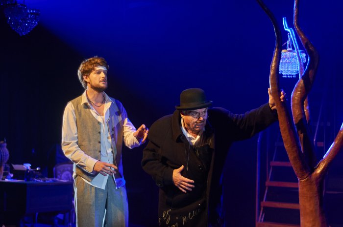 Диалог реальности и пространства грёз не ограничивается галереей литературных творений Зондергаарда. Мерцают, жужжат электричеством люстры – и сны вихрями ветра врываются на сцену, буквально пробивая и прорезая стены. Оттуда туман подсознательного выбрасывает на поэта десятки листов: сначала нетронутых бумажных, затем – осенних, кленовых… Последние приносят с собой стихи барда Суханова, рефреном проносящиеся через весь спектакль: «О, больная, прекрасная осень!» Оттуда же материализуется и Ганс Христиан Андерсен, эксцентрично воплощённый Евгением Ратьковым.