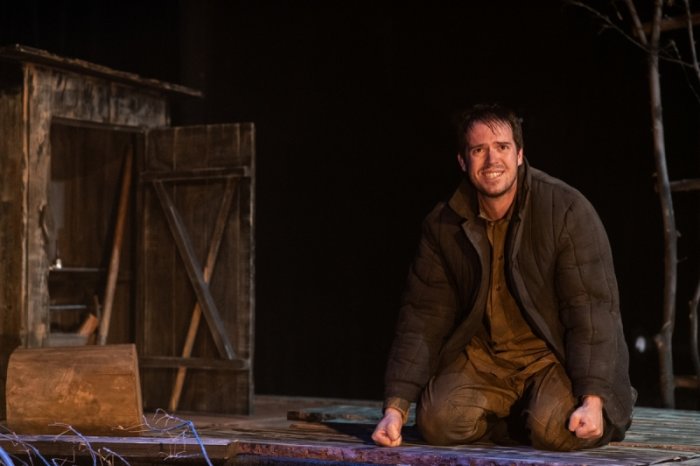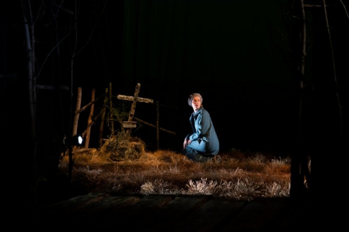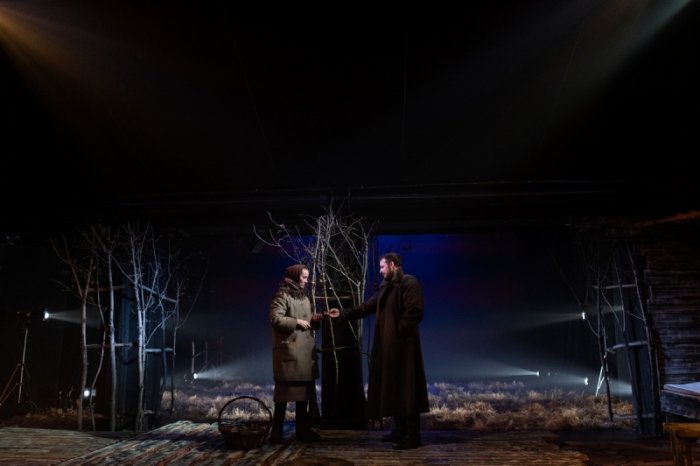 Спектакль идёт на камерной сцене. В центре площадки (художник Александр Плинт) стоит столб, делящий пространство на части, отмечая условную границу планов. Настлан дощатый пол, справа две деревянные стены образуют угол, где воспроизведена обстановка деревенского жилища, бани или зимовья: одна стена с маленьким окном, другая с дверью, в железной печке мерцает огонь, вдоль стен стоят нары и стол, есть лавка. Второй план занимает поле или луг, устланный скошенной сухой травой. Над залом простёрта ткань тревожного цвета, дыма и огня.