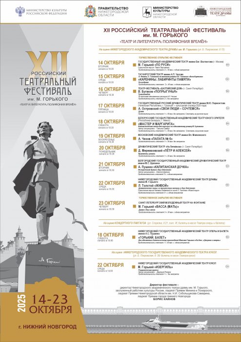 Помимо спектаклей, в программе фестиваля – выставки, лекции, неформальные встречи с представителями театров-участников, экскурсии по историческим местами, связанным с Максимом Горьким.