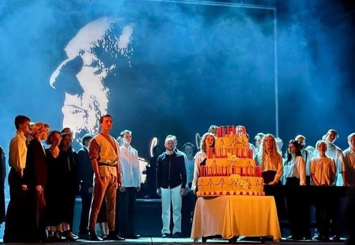 В финале вечера на сцену выкатили огромный торт, на котором горели 92 свечи, все актеры собрались под мерцающим профилем Марка, который построил этот храм, а голос Андрея Вознесенского читал откуда-то из поднебесья строки, ставшие вечностью: