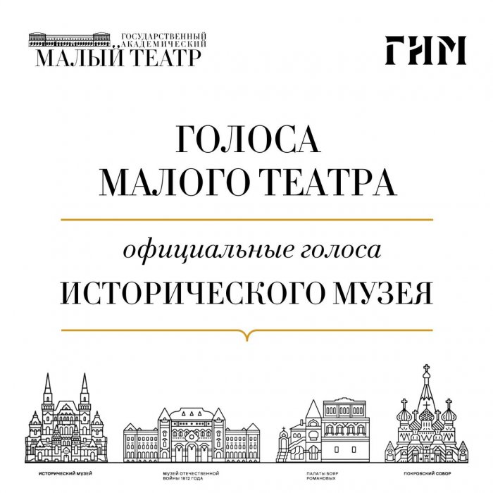 Малый театр и Государственный исторический музей запустили новый совместный проект – «Голоса Малого театра – официальные голоса Исторического музея». Теперь аудиогиды по всем постоянным экспозициям музея записаны артистами легендарной труппы.