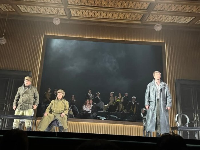 Совершенно невероятная сценография Максима Обрезкова все время переносила нас из одного мира в другой, словно легким взмахом кисти гениального художника смахивая со сцены один мир, и открывая другой, который уже война. Тут еще интриги, страсти, флирты и забавы, а там – окопы, дым, долг, честь и бессмысленность потерь… Картина войны, обрамленная золотой рамой, нависает над миром интриг, никого не трогая и не волнуя, словно она из другой эпохи. Но эпоха одна, и все может в любой момент поменяться местами, хотя происходит в параллельных пространствах. И всё почти одновременно, и на одной сцене, и на едином дыхании. Динамика событий такова, что не успеваешь оторвать от потрясающих актеров глаз, перевести дух, и уж тем более – вспомнить про антракт, которого нет. Как и в жизни, которая летит без антракта, но в любой момент может или перевернуться, или оборваться.