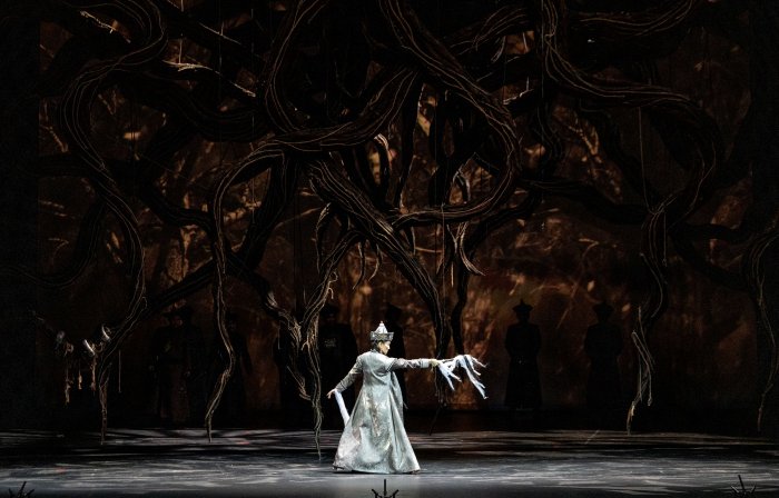 К излишней предсказуемости сценического действия есть вопросы, но музыку оперы можно смело исполнять в концертах, а декорационное оформление отправлять на выставку. Впрочем, деревянные изделия разных фактур, цветов, размеров, подвешанные к колосникам и расставленные на сцене, частично с выставок и заимствованы. Сценограф спектакля, заслуженный художник России Даши Дамдаков верен своим принципам — скоблит, обжигает, тонирует дерево, придает ему причудливую форму. Расписные сундуки, выступающие по ходу действия и утварью, и трибуной; ритуальные маски, символизирующие духов предков и духов-хранителей, — сами по себе произведения искусства.