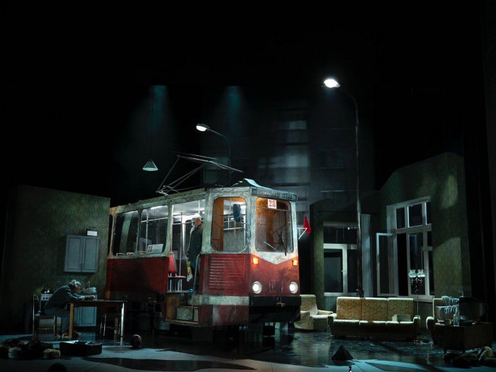 Эта постановка – путешествие в пространстве и времени, где гиперреалистичность материального мира смешивается с сюрреалистическими сценами сновидений. Реальное начинает соединяться с воображаемым в тот момент, когда трамвай въезжает в пространство квартиры. При этом, как и бывает в жизни, драматизм ситуации не лишён юмора. Референсами для режиссёра стали эпизоды из британского сериала «Чёрное зеркало», эстетика кино Кристофера Нолана, в особенности – «Интерстеллар», а также образы из «Толкования сновидений» Фрейда и Египетской книги мёртвых.