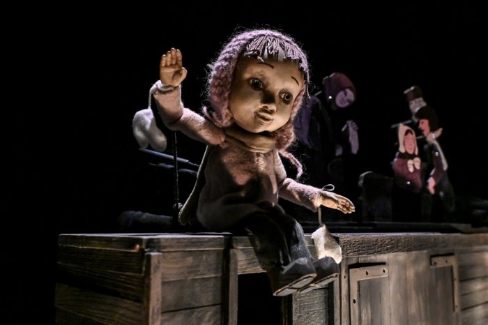В темноте сцены появляются маленькие герои. Живые планшетные куклы с серьёзными лицами, в тёмных платьях и маленькой обуви. Их движения подробны и правдивы. Склонив голову набок, девочку Люсю слушает мама, папа всех обнимает, а потом, улыбаясь, качает дочку на ноге: