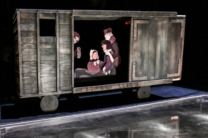 Любопытные интонации Люси в исполнении Арины Згурской естественны и правдивы. Рядом с мамой она не боится ничего и воспринимает поездку в закрытых вагонах как путешествие. Деревянный вагон, наполненный укутанными людьми (плоскостные куклы), едет в темноте сцене, а на проекции мелькают цепи таких же вагонов, деревья и ленты дорог, заполненных военной техникой, из окон которой выглядывают крылышки. Словно каждый человек, находящийся в них, всё ещё мечтает о своей сказке. В детских впечатлениях Люси соединяются сон, мечта и сказка. И вот она уже видит, что они приехали в чужой город, и сказочными дорогами через повествование о Волке и семерых козлятах, молочнице (Наталья Балдина, Арина Жарикова) и почтальоне (Николай Архипов, Фёдор Псарёв, Анатолий Пристай) с войны вернулся отец.