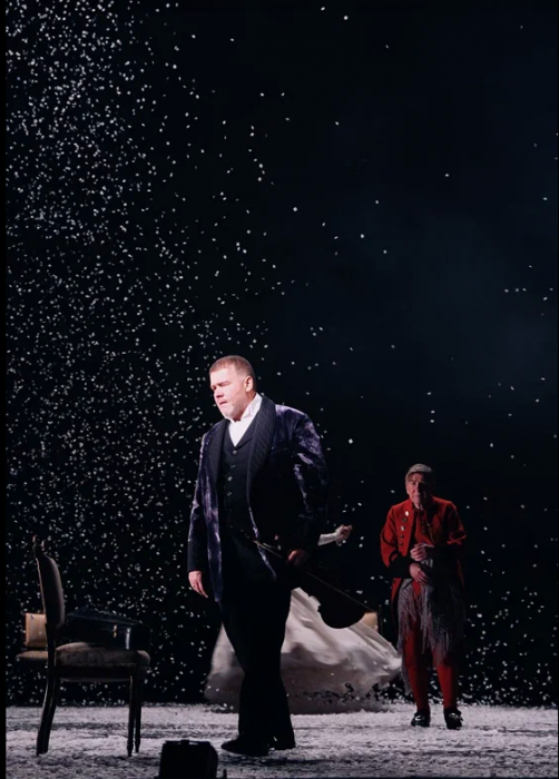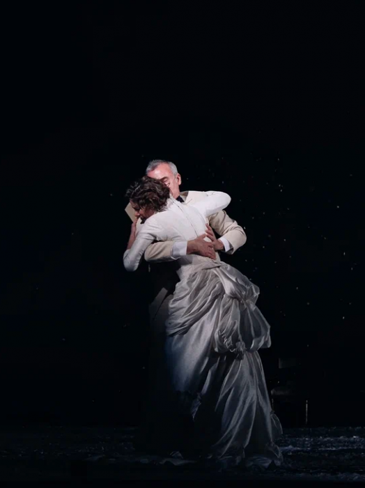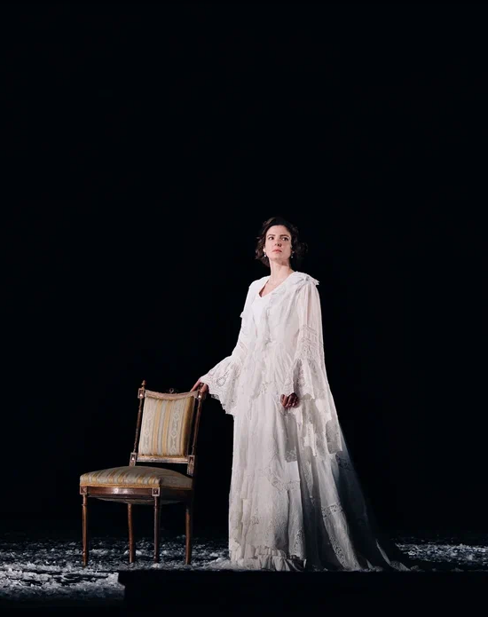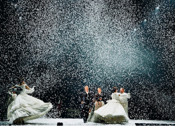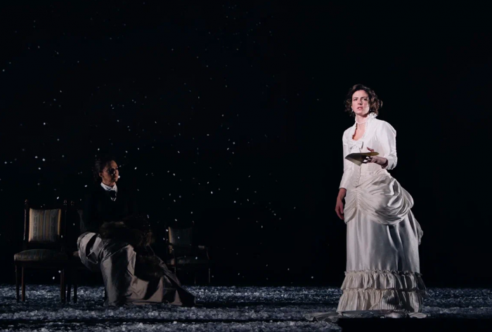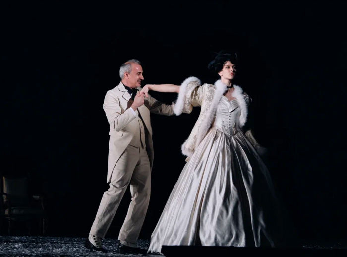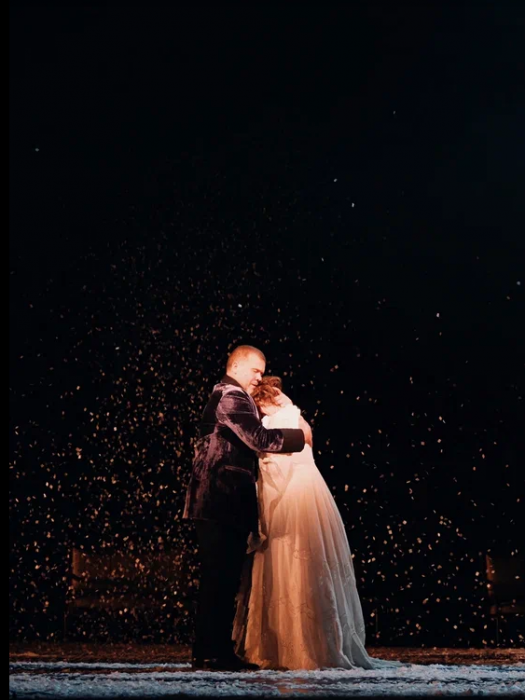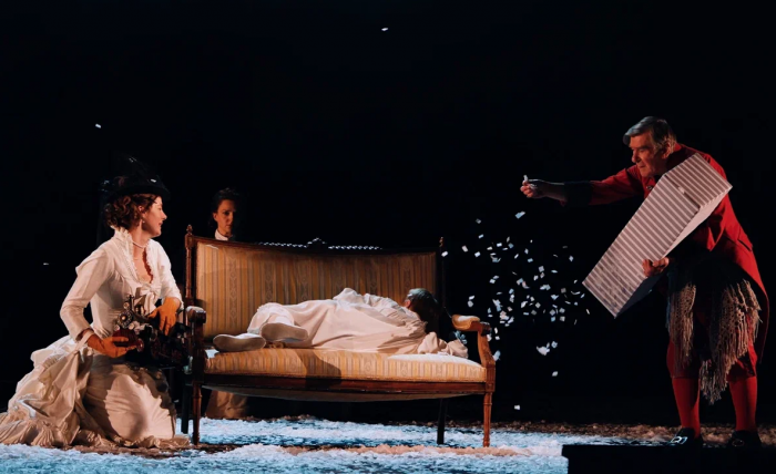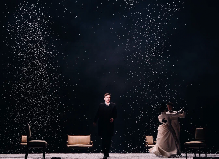 На протяжении всего спектакля мы слышим минорные звуки рояля и виолончели. Периодически по сцене кружатся в вальсе грациозные пары. И всё это под падающий снег, нарезанный из белой бумаги. Снег, символизирующий хрупкость человеческих чувств и бытия в целом. Он сопровождает всё действие и в финале, превратившись в роковую метель, уносит с собой Анну.