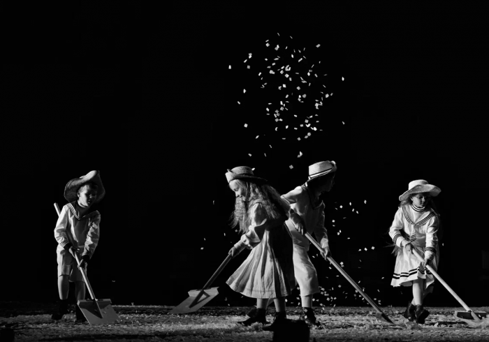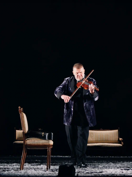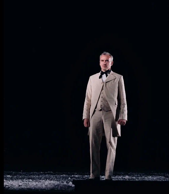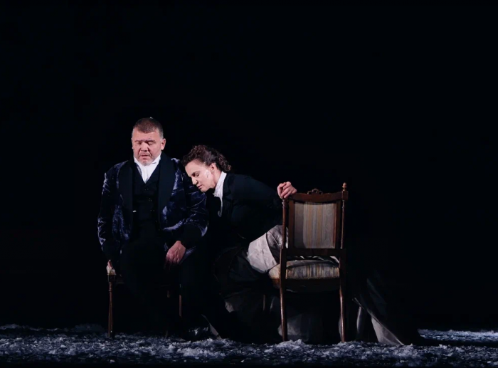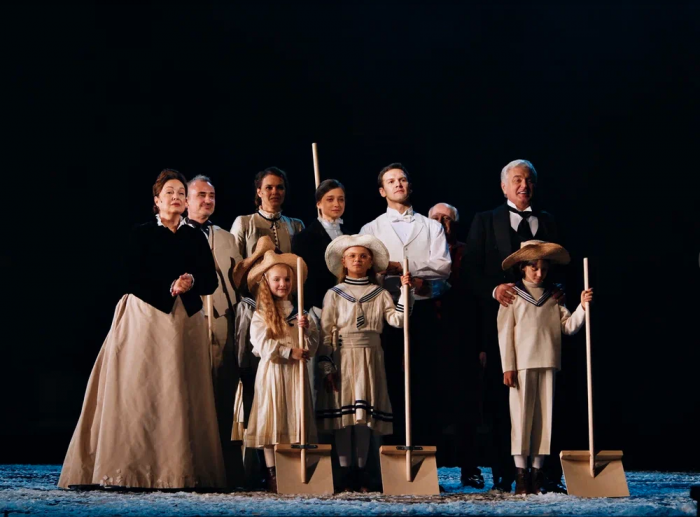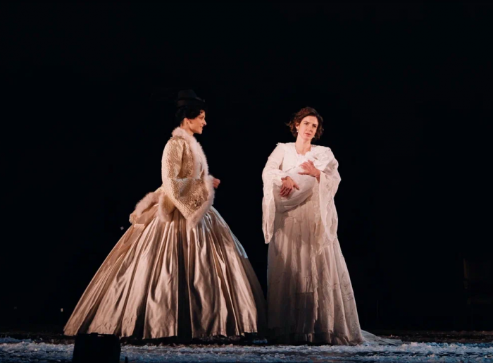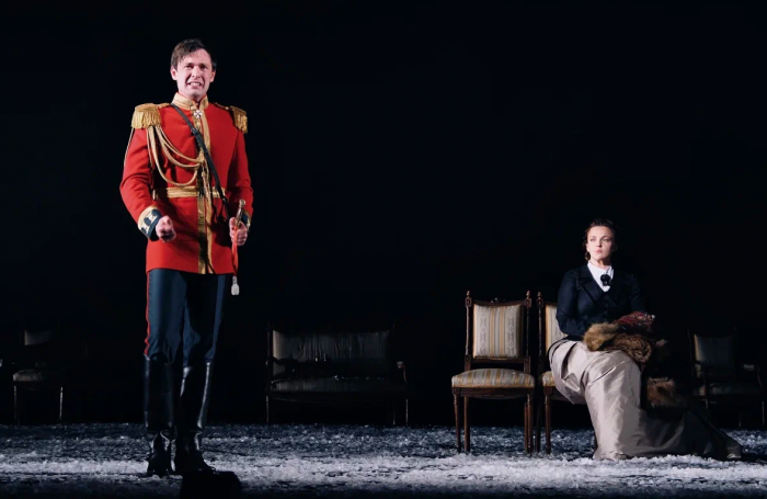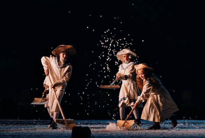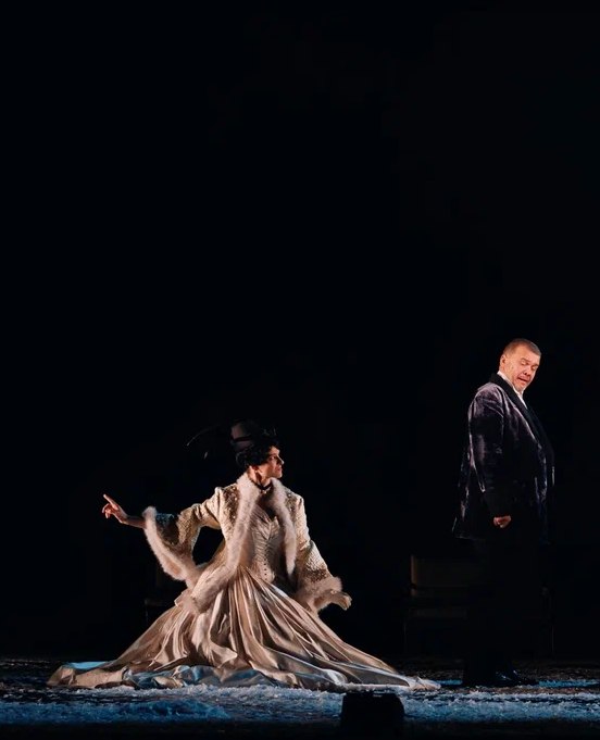 На протяжении всего спектакля мы слышим минорные звуки рояля и виолончели. Периодически по сцене кружатся в вальсе грациозные пары. И всё это под падающий снег, нарезанный из белой бумаги. Снег, символизирующий хрупкость человеческих чувств и бытия в целом. Он сопровождает всё действие и в финале, превратившись в роковую метель, уносит с собой Анну.