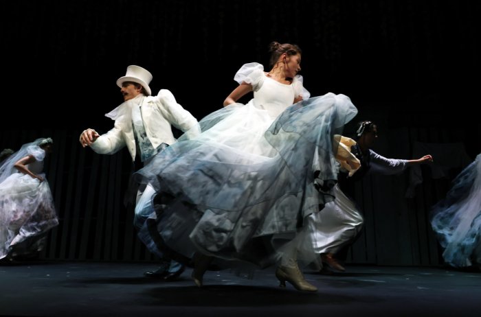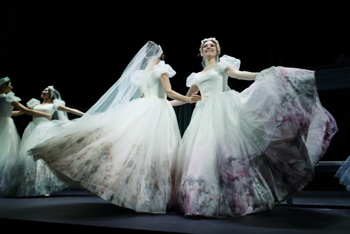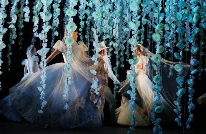 Во время сна Бальзаминова по сцене летают – то падая, то поднимаясь откуда-то из глубин бальзаминовской фантазии – белоснежные цветы на лианах. Их необычайную легкость поддерживают парящие, словно облака, платья хореографической группы невест, о которых грезит Михайло Дмитрич. Неповторимый характер каждой подчеркивают пышные, скрывающиеся под прозрачной тканью, подолы (художник по костюмам Мария Боровская). Так и складывается атмосфера желаемой Бальзаминовым свободы – фантазии, где возможно все. «В сумерках отчего ж и не заняться иногда, не помечтать-с?», – говорит Михайло Дмитрич.