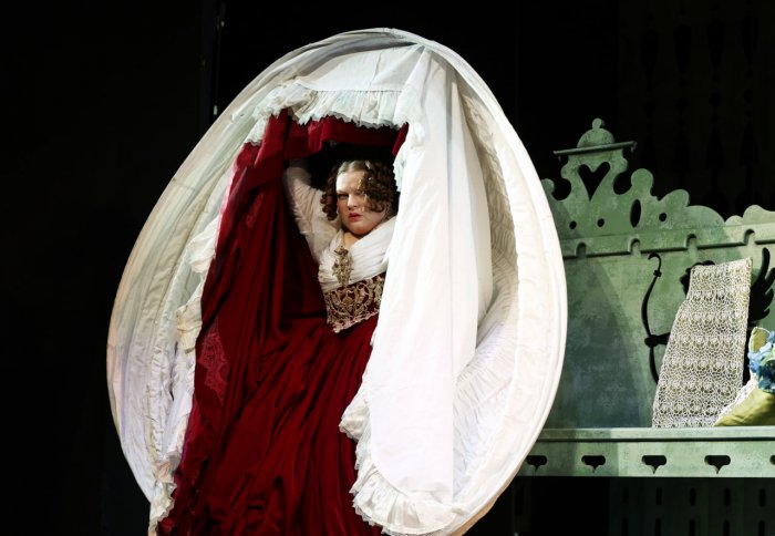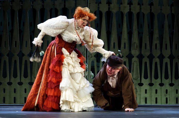 «Каждый имеет возможность нарисовать свое счастье сам. Во сне. Бальзаминов тоже нарисовал свое счастье: высокий стройный блондин», – подчеркивает Сергей Газаров. Однако, как и в жизни, на смену фантазии приходит реальность, с которой приходится считаться. Об этом напоминает технически сложная сценография (художник Евгения Шутина), составленная в несколько уровней из бесконечной протяженности оград. Первый ярус – забор с широкими воротами. Второй – деревянная конструкция, в ее центре – множество замков. Третий уровень похож на два предыдущих. И над всем этим возвышается кровать Бальзаминова с одеялами и подушками в рюшах. «Разбудила на самом интересном месте!» – сокрушается Михайло Дмитрич. В общем, мечтать нужно, но забывать о реальном мире не стоит, иначе может это все плачевно закончиться.