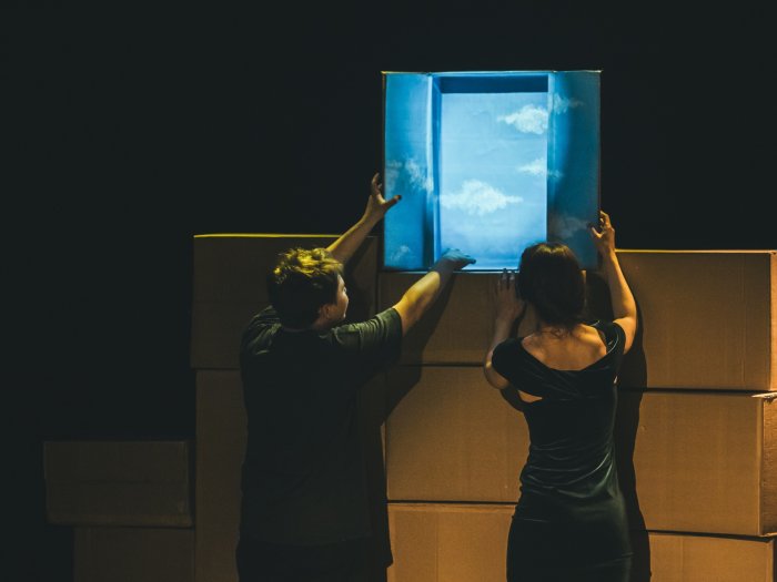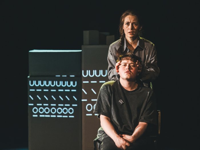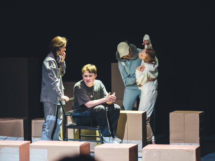 Внешний мир — та реальность, в которой вынуждены существовать мама и Лева, — помимо прочего, еще и неустойчивый, неуютный. Такие ощущения возникают от визуального решения (художник Нанна Шех): тут все предметы интерьера, квартиры, улицы, больничные кабинеты — это обычные коробки в разных конфигурациях, на которые проецируется видео (Роман Семочкин). Иногда он оказывается избыточен, например, когда пришедшая в гости Люси открывает холодильник, однако есть и удачные решения в видеопроекции: из значков лицевых и изнаночных петель складываются то радостные, то удивленные, то печальные мальчишечьи лица, а сами значки, то и дело возникая и ритмично двигаясь, становятся похожи на какую-то неизведанную письменность. Эти образы поддерживают метафору иного языка, шифра, к которому мы становимся причастны, который можем понять.