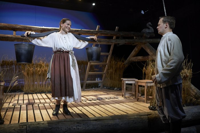 «Мы хотели оставить: ощущение и простоты, и фантасмагории, и сюрреализма…», – рассказывает режиссер. Художник Алан Саймин воссоздает условный мир деревни на сцене: высохшая трава, постройки из бревен, громадные ухваты, которые как несущие конструкции удерживают декорации.