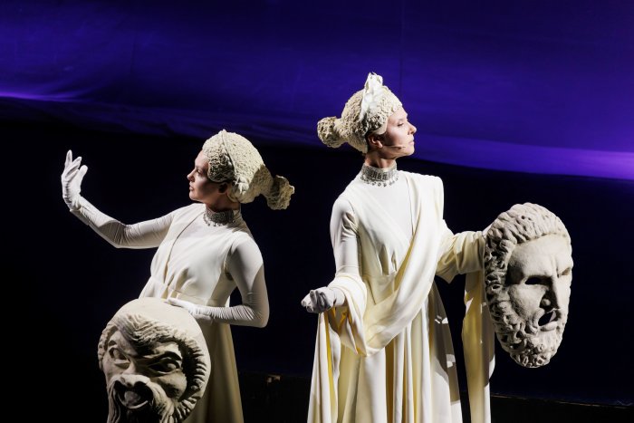 Чтобы вовлечь новых зрителей в театральную историю, на современную сцену сходят с барельефа на фронтоне театра Аполлон с двумя музами. Привычный ярославцам архитектурный рельеф оживает и рассказывает о недоступной древности, а заодно тут формулируется главное: театральному человеку помочь могут только боги.