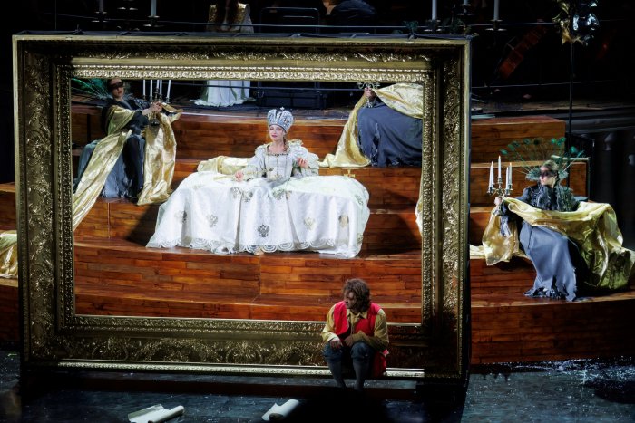 Федор Волков, понимая, что театр можно построить только как государственный проект, попав в ярмо царей, осуществляет правильный выбор: остается с императрицей. Она пока еще мила, даже эротична: целует, шепчет, намекает на фаворитство. Волкова затаскивают в заговор. Харизматичный актер Волков нужен Фике, как Годунову нужен Шуйский, – для сокрытия правды об убийстве Петра III. Актер умоляет пощадить сидельца в Ропше, но кто же станет слушать артиста? Перед смертью огромная шапка Петра становится колыбелью, которую он безвольно, апатично качает. Волков все знает и вынужден подчиниться. Мы видим Фике уже в обличии Екатерины II – в сияющем парадном портрете, в золоченой раме. Моментально меняется интонация: теперь тираноборка Екатерина II сама стала тираном, повторяет за мужа его жесты и слова: «Что народу нужно, это я решаю». Артисту, от которого потребовали только подчинения, показали его место, и Федор Волков еле-еле произносит желаемое, существенное: «Для царской власти совесть надобна».