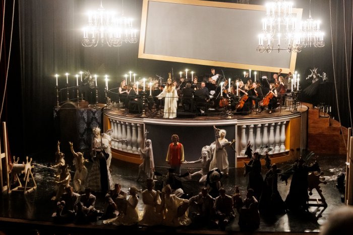 Музы объявляют сразу, что Федор Волков не только театр открыл, но и от театра умер, простудившись на своей уличной постановке – феерии восшествия на престол Екатерины II. Структура спектакля построена так, что мы ждем этого объявленного финального события. И не дожидаемся, осознав в какой-то момент, что весь спектакль уже является этой феерией, а смерти нет. Режиссер словно показывает энциклопедию театральных приемов – как ранних, классицистских, так и современных. Жизнь Волкова расположена внутри этой феерии. Шествие «Торжествующей Минервы» действительно сопровождает все действо (титры: «За три года до маскарада», «за шесть лет...»), бесконечно откладывая момент смерти гения, создателя отечественного театра.