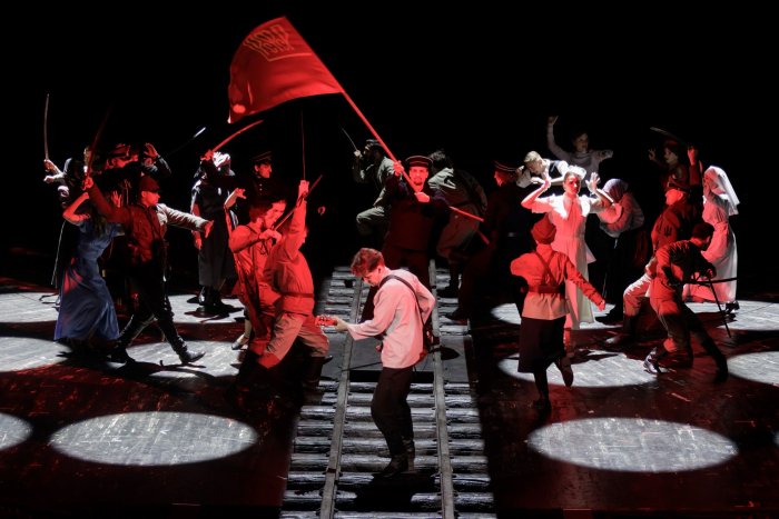 Важно забытовленное, конкретное ощущение стадий исторического процесса: что из чего вышло, почему происходят те или иные события. Важно восстановить причинно-следственную связь для новых поколений, для которых советская реальность – часто белый лист, или чересчур высветленный, или чересчур затемненный, где нет никаких градаций и засечек. Поэтому сценически оформленный роман Островского, где изображаются революционное насилие и революционная одержимость, должен показать цепочку унижения и насилия дореволюционного как первопричину народного бунта.
