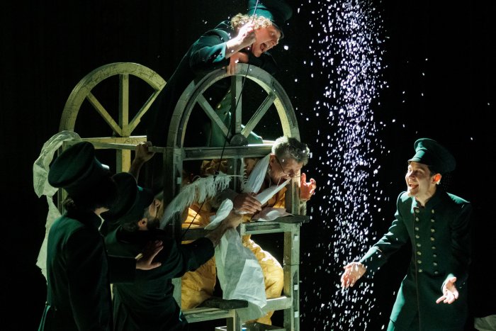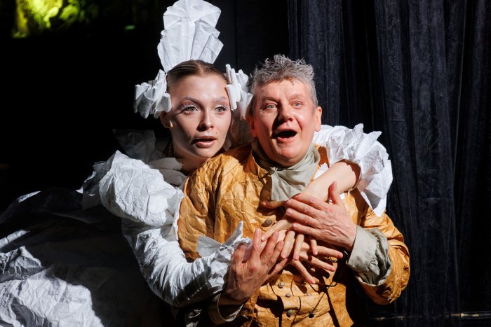 Самые сильные сцены спектакля – Федор Волков перед лицом власти: Елизавета Петровна, открывающая национальную сцену и перевозящая труппу из Ярославля в Петербург, Петр III и Екатерина Великая. Маневрируя подле этих величин, Волков находит возможности, но иной раз теряет себя. Величественная, сияющая Елизавета (Елена Шевчук), учредив театр, уходит из жизни, на ее место вступают юная Екатерина (Анастасия Савкина), пока еще Фике, в которой еще нет помпезности и царственности. Пока правит Петр III. Илья Варанкин делает из этой роли интереснейшего субъекта для психоанализа. Будущий удавленник ходит по сцене этаким деревянным солдатиком в гигантской широкополой шляпе, которая делает его неадекватно себя оценивающим гномом или щелкунчиком, безбожно истерит, как холерик и хам, проявляет себя крайне тиранически. Он готов беззаконно урезать бюджеты волковской труппе, не заинтересован в развитии театра (в Ораниенбауме у него своя немецкая труппа), ведет абьюзивный диалог с Волковым, указывая ему место комедианта. Этот Петр III играет сразу за себя и за батюшку, оба обрезанные борьбой за престол судьбы.