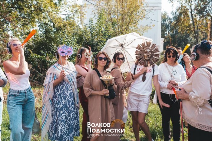 Кроме того, в Ярославле существует сегодня еще и аудиопрогулка «Волков. Голос» с участием труппы театра. Бродилка построена на обнаружении следов и голоса великого артиста в современном Ярославле. Зрители ходят по городу, не только по парадному Ярославлю, заходят во дворы и посещают заброшки. Краеведение обнаруживает как ложные следы Волкова (в том числе памятная доска на доме, где Волков не жил), так и истинные. Мы видим место, где располагался первый театр братьев-купцов. Останавливаемся у дома, где жил ссыльный Эрнст Иоганн Бирон, который, возможно, обучал Волкову наукам и первым рассказал ему о новых формах театральности на Западе. В спектакле учитываются и новейшие разработки волковской биографии: так в аудиопроменаде возле церкви Николы Надеина рассказывается не только об иконостасе, вырезанном Федором Волковым, но и о сходстве одной из фигур с его портретом, о чем в конце жизни писала выдающийся ярославский театровед, хранительница памяти Ярославской драмы Маргарита Ваняшова. Таким образом, спектакль делает законным гипотезу Ваняшовой и нелишним образом напоминает о ней. Говорится в спектакле и о неприятном: об избиениях артистов ярославцами, не принимавшими «дьявольское» актерское дело, и о разорении заводов купца Полушкина братьями Волковыми, потратившими наследство отчима на театральную деятельность. Променад «Волков. Голос» получился очень живым, информационно насыщенным, продлевающим знание об архаике в современные театральные формы.