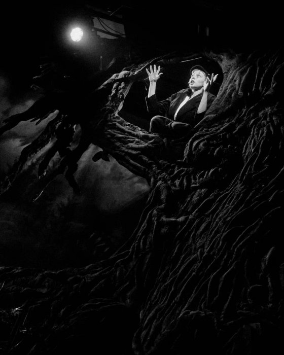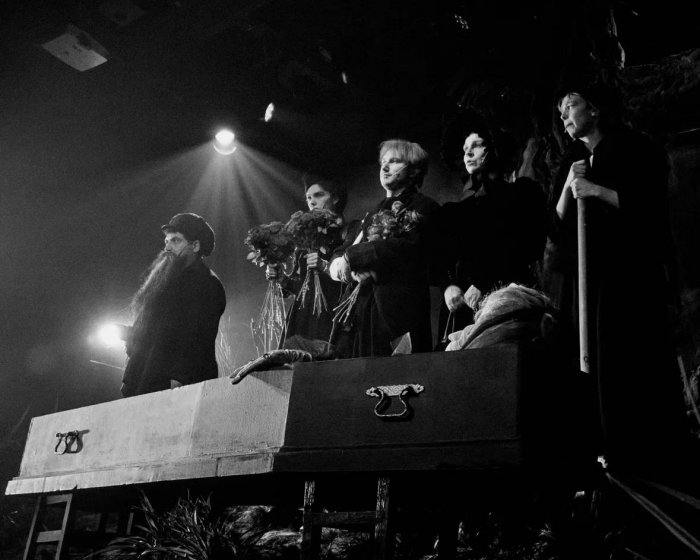 Всё это одновременно и черная комедия, и современная драма, где в какой-то момент все идет в топку вместе со старухой, и остается голая сцена и дуб из еловой фанеры. Уходит и живописный задник сцены, и дерн с камышами – вся бутафория (художник Мария Трегубова). Остаются только люди со своими, хорошо знакомыми зрителям, проблемами – бумажной волокитой при оформлении ритуальных услуг, дележом наследства, трудностями взаимопонимания и воспитания детей, опасениями за будущее…